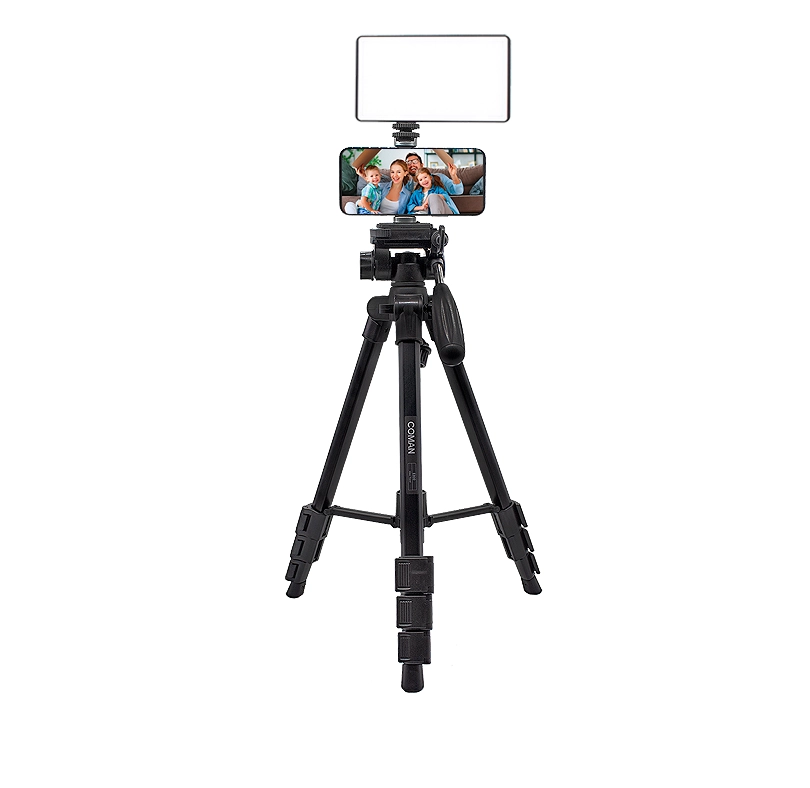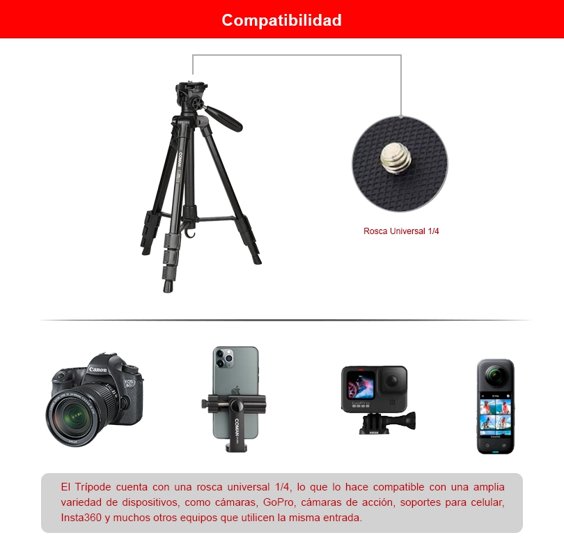 El kit incluye el popular trípode Coman E800, la opción preferida para la grabación de contenido gracias a su peso ligero de 1.35 kg y su tamaño compacto de 50 cm cuando está plegado. Además, alcanza una altura máxima de 143 cm, facilitando su transporte y permitiendo realizar grabaciones en cualquier lugar. Además, su construcción en aluminio con un acabado atractivo lo convierte en una herramienta ideal para cualquier entorno. Una de sus mayores ventajas es su cabezal, que ofrece un movimiento muy suave, permitiendo realizar grabaciones profesionales con transiciones más sutiles y controladas sin interrupciones.