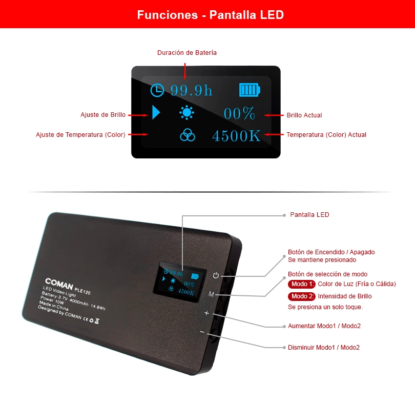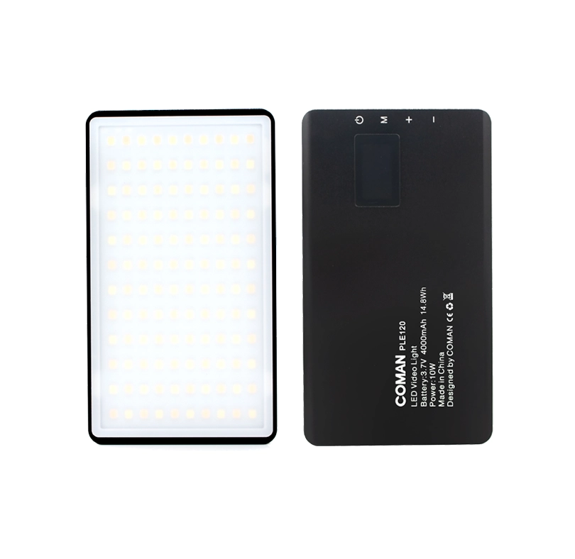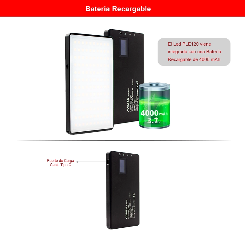 El kit incluye la luz LED profesional Coman PLE120, una luz potente que es perfecta para grabar contenido con grupos de personas o iluminar grandes áreas, siendo especialmente útil en exteriores donde se requiere una mayor iluminación. Una de sus principales ventajas es su capacidad de ser bicolor, lo que te permite ajustar la temperatura de color desde luz cálida (3300K) hasta luz fría (5600K). Esta flexibilidad te brinda la posibilidad de crear contenido con diferentes tonos de colores, permitiéndote destacar y sobresalir en tus grabaciones. Esta luz LED ofrece la opción de ajustar la intensidad del brillo desde el 0% al 100%. Además, cuenta con una batería recargable que facilita su uso tanto en interiores como en exteriores. Con un CRI de 95, garantiza una calidad de iluminación superior en comparación con otras marcas. Además, esta luz LED tiene opciones de montaje universales, lo que permite usarla en diferentes soportes como parantes, trípodes o incluso encima de cámaras profesionales con zapata universal.