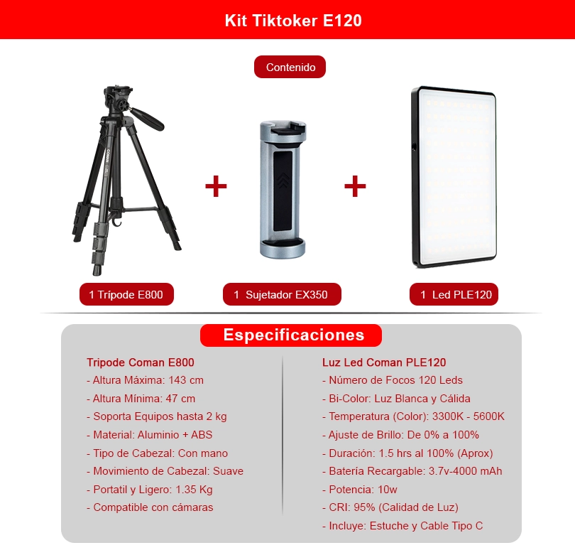 Lleva tus TikToks al siguiente nivel con este kit, que incluye la luz LED Coman Profesional PLE120. Esta luz cuenta con 120 LEDs bicolor, permitiéndote ajustar el brillo del 0% al 100% y la temperatura de color entre 3300K (luz cálida) y 5600K (luz fría). Su diseño elegante y acabado de aluminio le dan un toque profesional. La batería recargable te permite utilizar este kit tanto en interiores como en exteriores. Es perfecto para grabaciones que requieran más luz o en grupo.